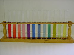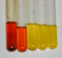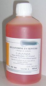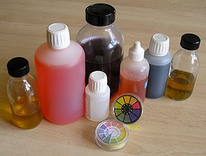 Chez la majorité des fournisseurs[18] les indicateurs colorés sont d'autre part vendus sous le nom explicite de teinture quand ils sont en solution[19] (photo ci-contre).