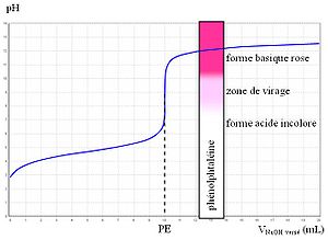Le pH du P. E. se situant aux alentours de 9, on utilise quelques gouttes de phénolphtaléine (virage 8, 2-10), ajoutées dans le mélange réactionnel. L'équivalence se repère par conséquent par le changement de couleur. La solution titrée est incolore dans la première partie de la manipulation. On ajoute progressivement de la soude et la solution passe au rose à l'équivalence, c'est-à-dire quand acide et base sont dans les proportions stœchiométriques.