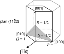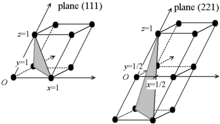 Donc dans le cas d'un réseau cubique, le vecteur [hkl ] est perpendiculaire à la surface, c'en est un vecteur normal. Dans le cas général, il faut changer de base pour que le vecteur de coordonnées (h, k, l ) soit perpendiculaire au plan (cf. infra).