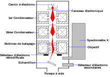 Un microscope électronique à balayage est principalement composé d'un canon à électrons et d'une colonne électronique, dont la fonction est de produire une sonde électronique fine sur l'échantillon, d'une platine porte-objet servant à déplacer l'échantillon dans les trois directions et de détecteurs servant à capter et d'analyser les rayonnements émis par l'échantillon. En outre l'appareil doit obligatoirement être équipé d'un dispositif de pompes à vide[4].