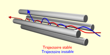 Une fois piégés dans la cellule, les ions ont par conséquent la même trajectoire mais pas la même position à un instant déterminé (a).