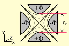 Un quadripôle (ou quadrupôle) est constitué de quatre électrodes parallèles de section hyperbolique ou cylindrique. Les électrodes opposées distantes de 2r0 sont reliées entre elles et soumises au même potentiel.