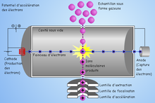 - Les ions peuvent se fragmenter dans un spectromètre de masse : dans la source d'ionisation, dans l'analyseur ou dans une cellule de collision. Comme les fragmentations respectent des lois précises de chimie en phase gazeuse, l'étude de ces fragments sert à déterminer la structure des ions.