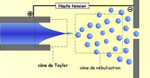 Son principe est le suivant : à pression atmosphérique, les gouttelettes de solutés sont constituées à l'extrémité d'un fin capillaire porté à un potentiel élevé. Le champ électrique intense leur confère une densité de charge importante. Sous l'effet de ce champ et grâce à l'assistance éventuelle d'un courant d'air co-axial, l'effluent liquide est transformé en nuage de fines gouttelettes (spray) chargées suivant le mode d'ionisation. Sous l'effet d'un second courant d'air chauffé, les gouttelettes s'évaporent progressivement. Leur densité de charge devenant trop importante, les gouttelettes explosent en libérant des microgouttelettes constituées de molécules protonées ou déprotonées de l'analyte, porteuses d'un nombre de charges variable.