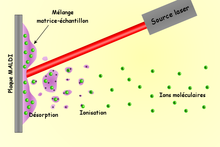 Un faisceau laser pulsé est utilisé, le plus souvent dans le domaine des ultraviolets, pour désorber et ioniser un mélange matrice/échantillon cocristallisé sur une surface métallique, la cible.
