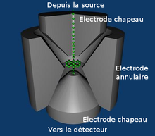 Le piège est constitué de trois électrodes à section hyperbolique : une électrode annulaire encadrée par deux électrodes-chapeaux (d'entrée et de sortie) qui forment les calottes supérieure et inférieure du système. Une tension en radiofréquence combinée ou non à une tension continue U est appliquée entre l'électrode centrale et les deux électrodes calottes. [2] Le champ résultant est alors tridimensionnel.