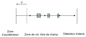 Un analyseur à temps de vol se compose d'une zone d'accélération où est appliquée la tension accélératrice, et d'une zone nommée tube de vol, libre de champ. Les ions accélérés pénètrent dans le tube de vol libre de tout champ. La séparation des ions ne va par conséquent dépendre que de la vitesse acquise lors de la phase d'accélération. Les ions de rapport m/z le plus petit parviendront au détecteur les premiers. Pour chaque groupe d'ions de même rapport m/z, un signal est enregistré au niveau du détecteur sous la forme d'une fonction temps/intensité.