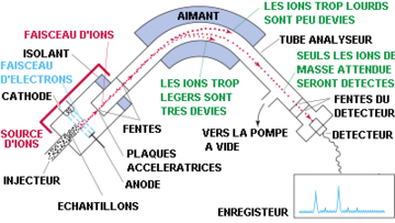 - Le détecteur et dispositif de traitement : le détecteur transforme les ions en signal électrique. Plus les ions sont nombreux, plus le courant est important. Qui plus est , le détecteur augmente le signal obtenu pour qu'il puisse être traité informatiquement.